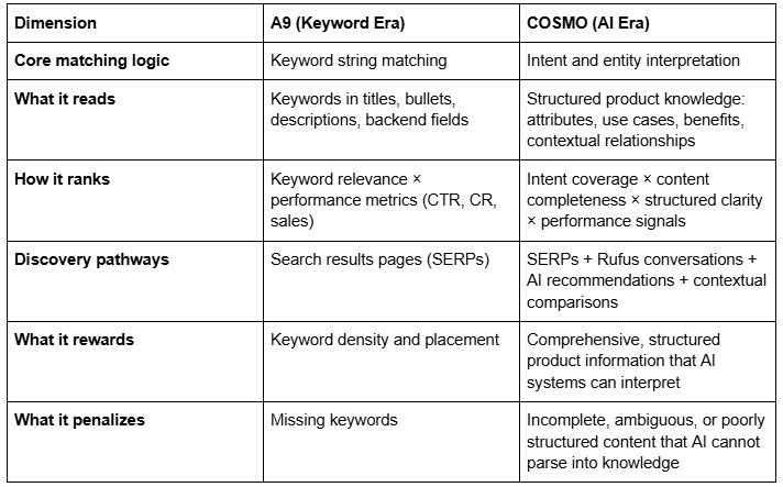 A9 ranked products by matching keywords in listings to keywords in search queries, weighted by performance metrics. COSMO interprets product content as structured knowledge and matches it to shopper intents, use cases, and contextual needs. A9 rewarded keyword density. COSMO rewards content completeness, clarity, and structured interpretability.