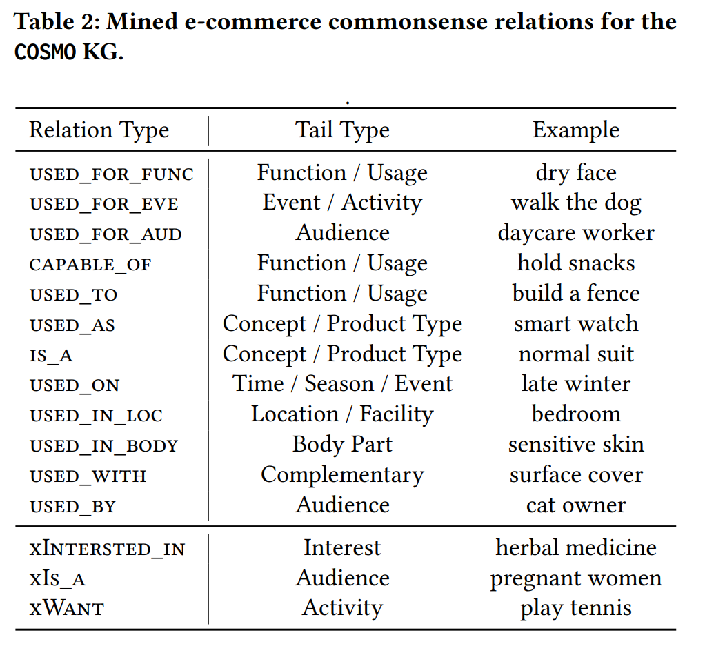 The 15 relationship types are published in Table 2 of "COSMO: A Large-Scale E-commerce Common Sense Knowledge Generation and Serving System at Amazon" (Yu et al., SIGMOD-Companion '24). The paper includes the full relation list, tail types, and worked examples for each.