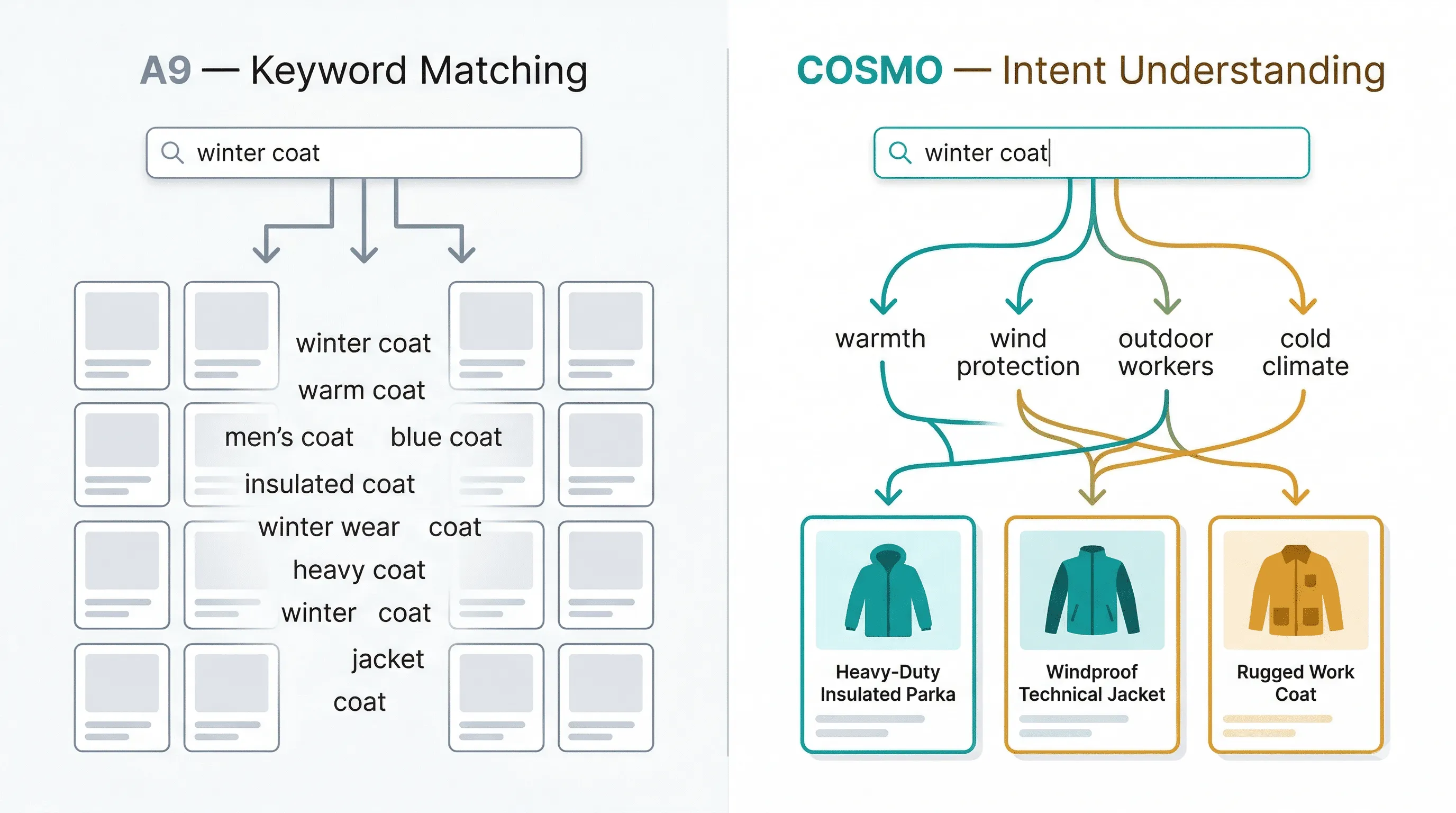 COSMO adds an intent understanding layer that fundamentally changes what Amazon considers "relevant." When a customer searches for "winter coat," COSMO doesn't just match the words - it maps the query against commonsense knowledge about warmth capability, wind protection, cold-weather use, insulation types, and the contexts in which winter coats are needed.