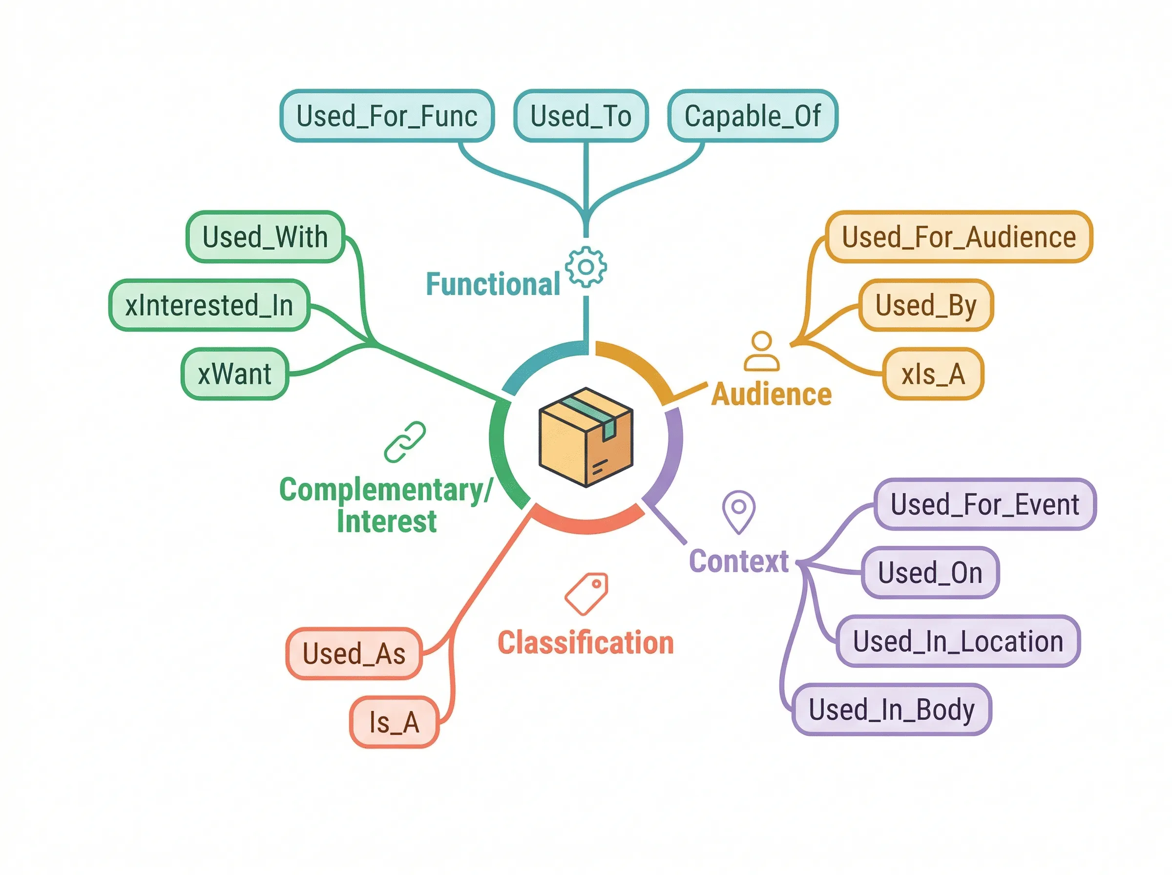 COSMO uses 15 relation types organized into five categories: Functional (Used_For_Func, Used_To, Capable_Of), Audience (Used_For_Audience, Used_By, xIs_A), Context (Used_For_Event, Used_On, Used_In_Location, Used_In_Body), Classification (Used_As, Is_A), and Complementary/Interest (Used_With, xInterested_In, xWant). Together, these relations map the complete semantic profile of why a customer would purchase a product.