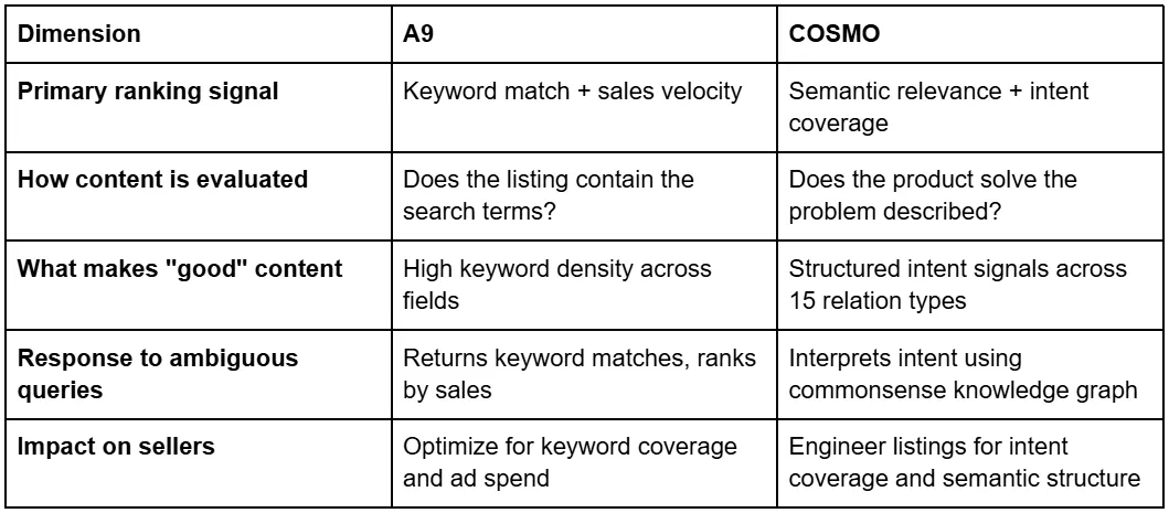 A9 matches keywords and ranks by sales performance. COSMO adds an intent-understanding layer that evaluates whether a product solves the problem described in a query, using 15 commonsense relation types. A9 asks "does this listing contain the search words?" COSMO asks "does this product address the shopper's underlying need?" Keywords still matter for indexing, but COSMO changes how Amazon evaluates relevance once a listing enters the candidate pool.
