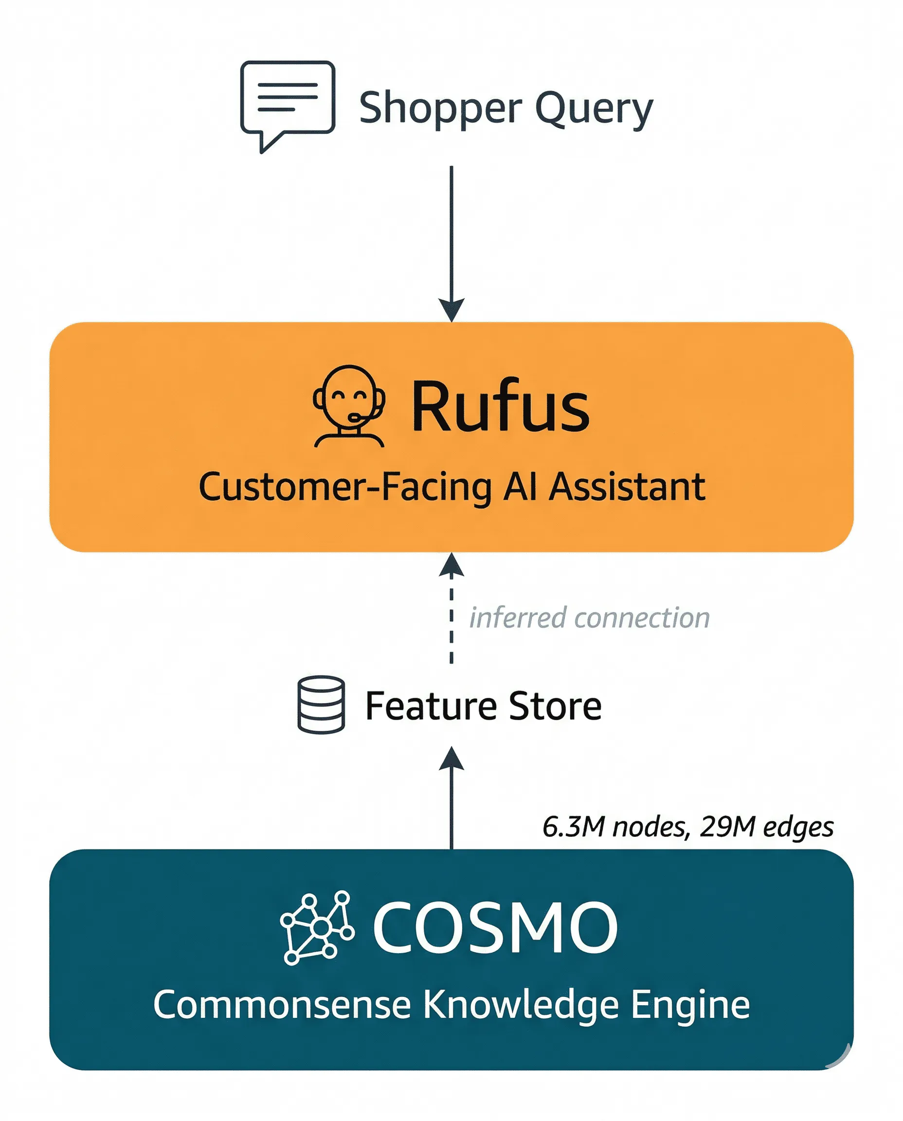 The industry inference: Both COSMO and Rufus operate in Amazon's search and discovery stack. COSMO generates exactly the kind of structured product-intent knowledge that Rufus would need to answer questions like "What's a good gift for a runner?" or "What yoga mat is best for bad knees?" The paper explicitly describes COSMO's Feature Store feeding "downstream applications." Whether Rufus is one of those downstream applications is a reasonable inference - but it is an inference, not a confirmed fact.
