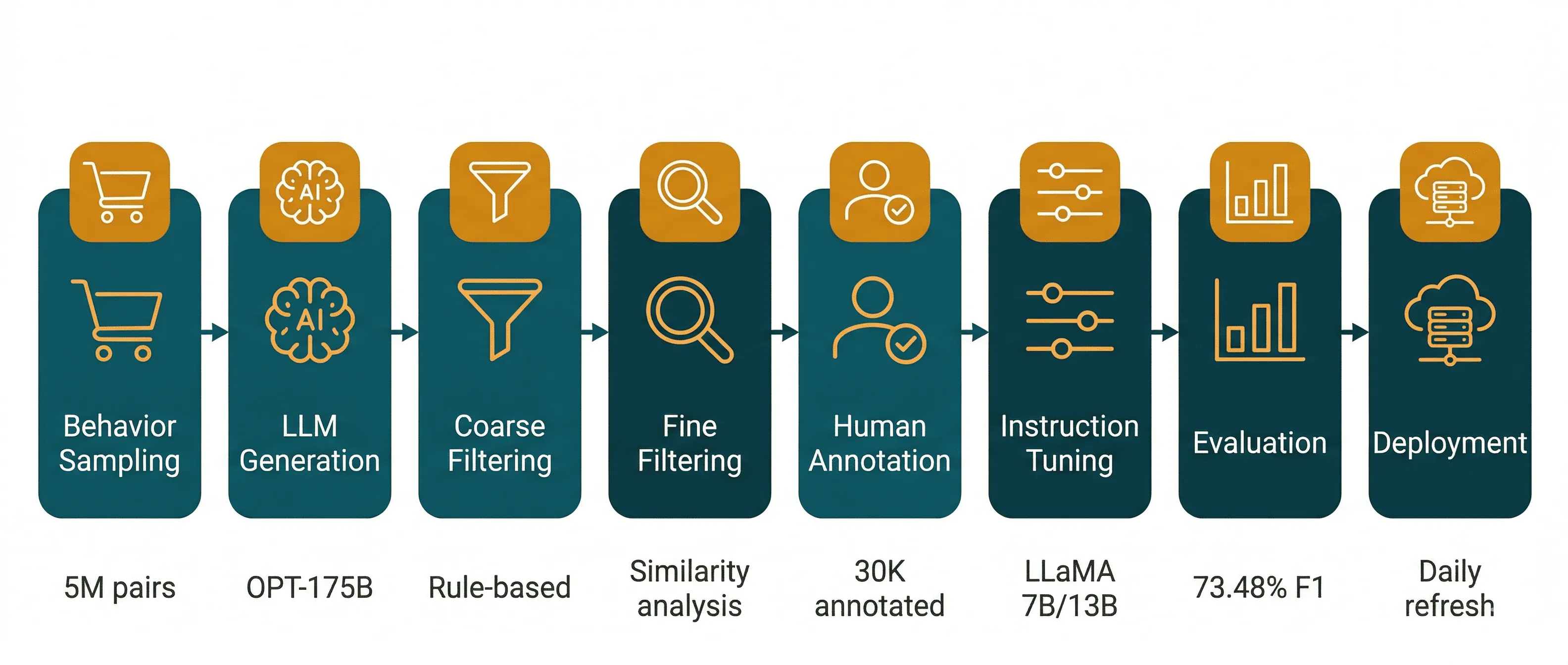 COSMO-LM is refreshed daily via Amazon SageMaker, ingesting customer behavior session logs. This daily refresh means the knowledge graph evolves continuously - but it also means the system cannot process real-time events like flash sales or sudden demand spikes.