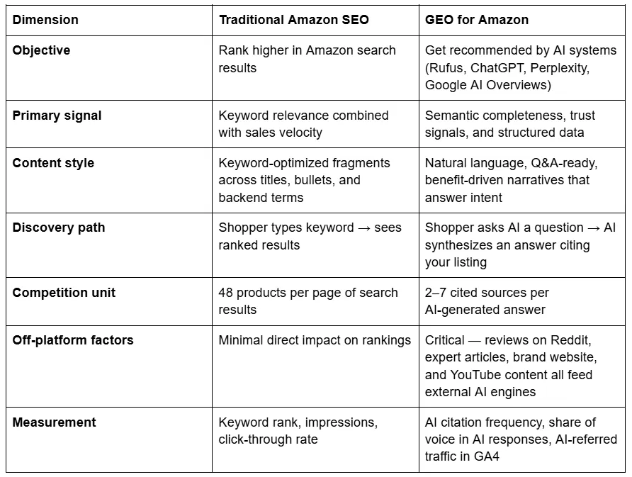 Traditional Amazon SEO optimizes for keyword matching and search rank position — getting your product onto page one for target search terms. GEO optimizes for AI interpretation and recommendation — getting your product cited by AI systems when shoppers ask natural-language questions. SEO deals with keyword relevance, sales velocity, and click-through rate. GEO deals with semantic completeness, intent coverage, structured data depth, and trust signals from both on-Amazon and off-Amazon sources. The signals, the competition unit (48 results per page vs. 2–7 citations per answer), and the optimization tactics differ fundamentally.